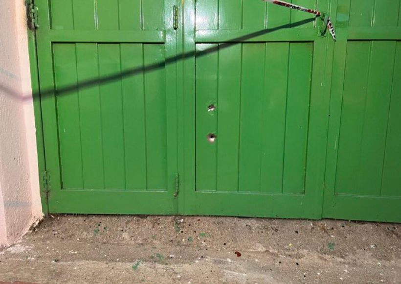 También se pudo observar el daño provocado por dos impactos de bala en el portón de la casa, en este caso en el garaje.