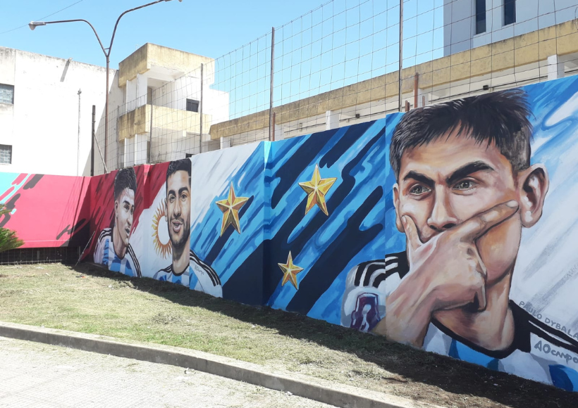 Las figuras de Julián Álvarez, Paulo Dybala, Nahuel Molina y el Cuti Romero fueron plasmadas por Ariel Ocampo en las paredes ubicadas en la intersección de avenida Vélez Sarsfield y la rotonda de Plaza de las Américas.