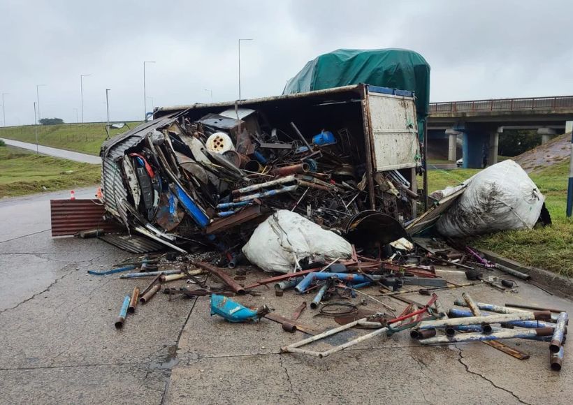 En esa maniobra se le fue el camión que terminó mordiendo la banquina de la bajada y arrancó un poste y al intentar doblar, el vehículo -que transportaba cartones y chatarra-, volcó.