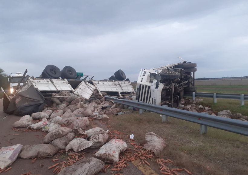 Un camión con acoplado cargado con más de 30 toneladas de zanahoria volcó en el kilómetro 660 de la ruta nacional 36 y sus dos ocupantes sufrieron heridas graves, por lo que permanecen internados en el Hospital Regional de Río Cuarto.