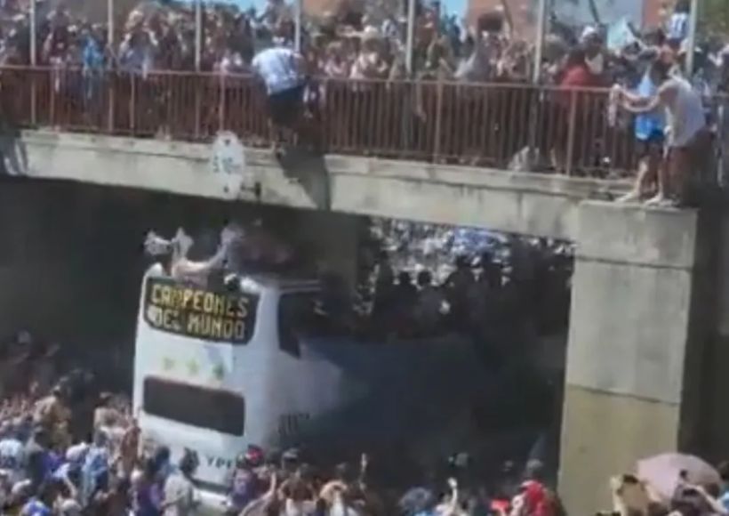 En medio de la caravana que partió del predio de la Asociación del Fútbol Argentino (AFA), llevando a la Selección argentina a la Ciudad de Buenos Aires, dos personas se tiraron de un puente al micro abierto.