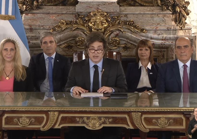 «Queridos argentinos tengo el agrado de dirigirme a ustedes con una noticia que muchos estábamos esperando», inició el presidente Milei su alocución, rodeado de todo su gabinete, incluido el ministro de Economía Luis Caputo, la ministra de Seguridad Patricia Bullrich, y la secretaria general de presidencia, Karina Milei.