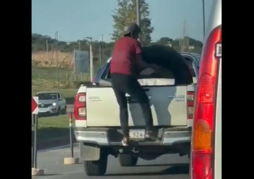 En un video que se volvió viral, se pudo apreciar cuando el ladrón se subió a la caja de carga de la camioneta Toyota Hilux e intentó llevarle un neumático de camión. Sucedió en la ruta 19.