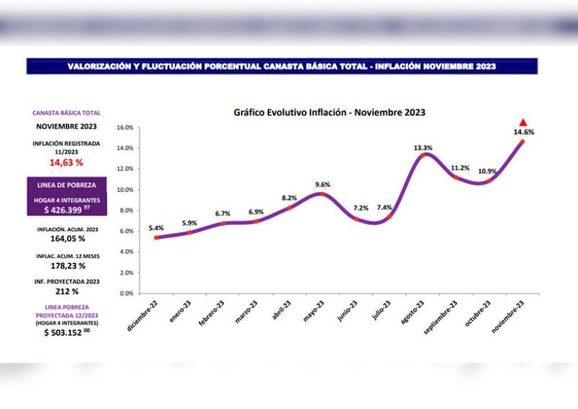 A su vez registró en noviembre la inflación más alta en lo que va de 2023. El estudio desarrollado en la provincia determinó una suba de 14,6% en el penúltimo mes del año, mientras que en la comparación interanual el aumento es de 178,2%. En tanto que durante once meses acumuló un alza de 164,1%.