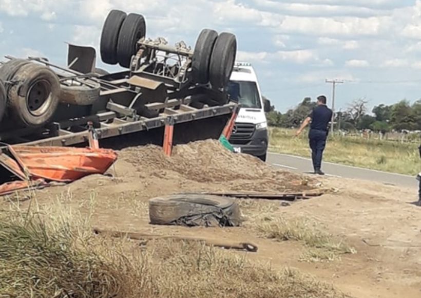 Un camión Scania 112 cargado con arena se tumbó en la Ruta Provincial 17, en el km 171, cerca de la localidad de La Para, el pasado viernes alrededor de las 16.