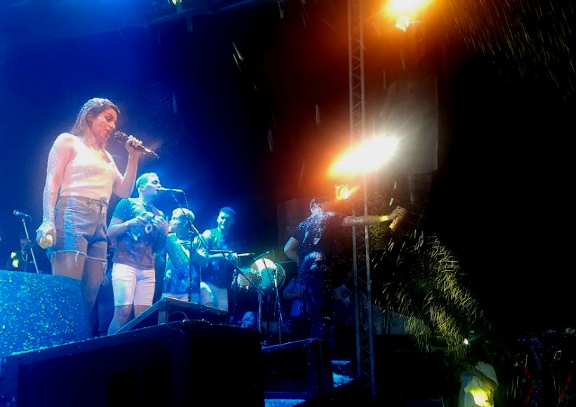 El cantante de la reconocida banda de cuarteto llenó el escenario -y a la intendente Verónica Gazzoni- de nieve loca junto a su socia en el escenario, Eugenia Quevedo.