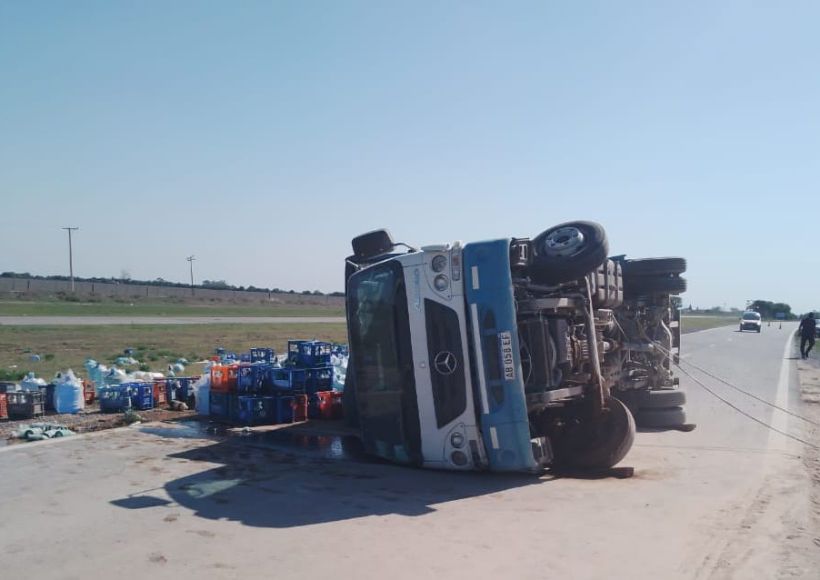 Un camión Mercedes Benz que transportaba bidones de agua y sifones de soda volcó sobre la Autovía 19, a tres kilómetros de Piquillín.