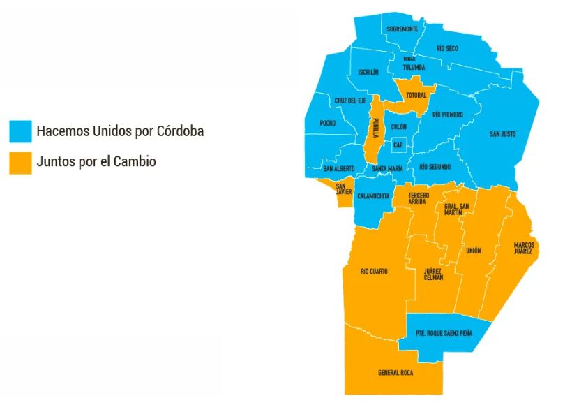 En cuanto a los 26 departamentos provinciales, incluida la Capital, el mapa también estuvo reñido y disputado: en 14 departamentos ganó Hacemos Unidos por Córdoba, mientras que los 12 restantes -principalmente el sur de la provincia- se impuso Juntos por el Cambio Córdoba.