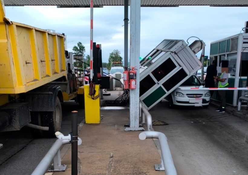 Una cabina de peaje cayó sobre un Chevrolet Corsa y de milagro no hubo heridos. El accidente ocurrió frente al Aeropuerto “Ambrosio Taravella” cuando se desprendió una varilla de hierro que era transportada por un camión.
