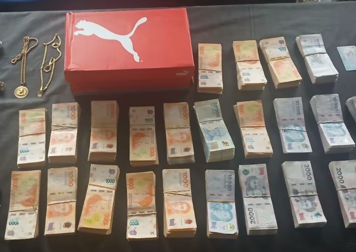 Al revisar el vehículo, los agentes hallaron una caja de zapatillas que contenía más de 8,5 millones de pesos en efectivo, además de alhajas, teléfonos celulares y otros elementos de valor cuya procedencia no pudo ser justificada.