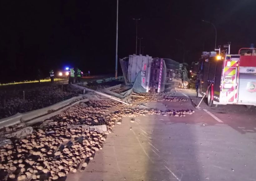 En horas de la madrugada, un camión Mercedes Benz con semirremolque que trasladaba 44 mil kg de papas, volcó en la intersección de Ruta 60 y Ruta 9 Norte, a la altura de la localidad de Sarmiento.